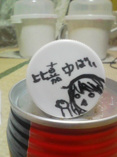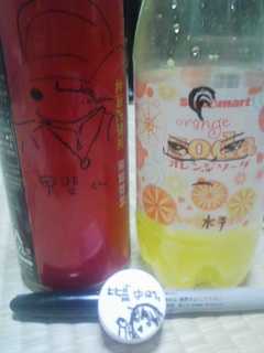 ペットボトルに描いてるのが木手、缶に描いてあるのが甲斐、下の白いのはペットボトルのフタで凛。