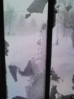 窓に雪が張り付いてます。窓の向こうっ側が白いのは光の関係でも窓がそういう加工されてるからでもないですよ?