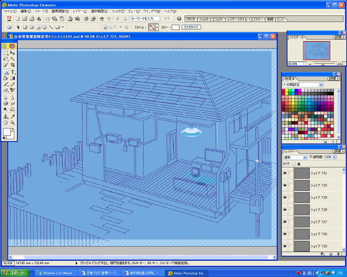 その後は微修正して、全部ラスタライズして、また微修正して、パーツに分けて統合して、モノクロじゃさすがに見目が悪いから色もちょっと塗ってー……。